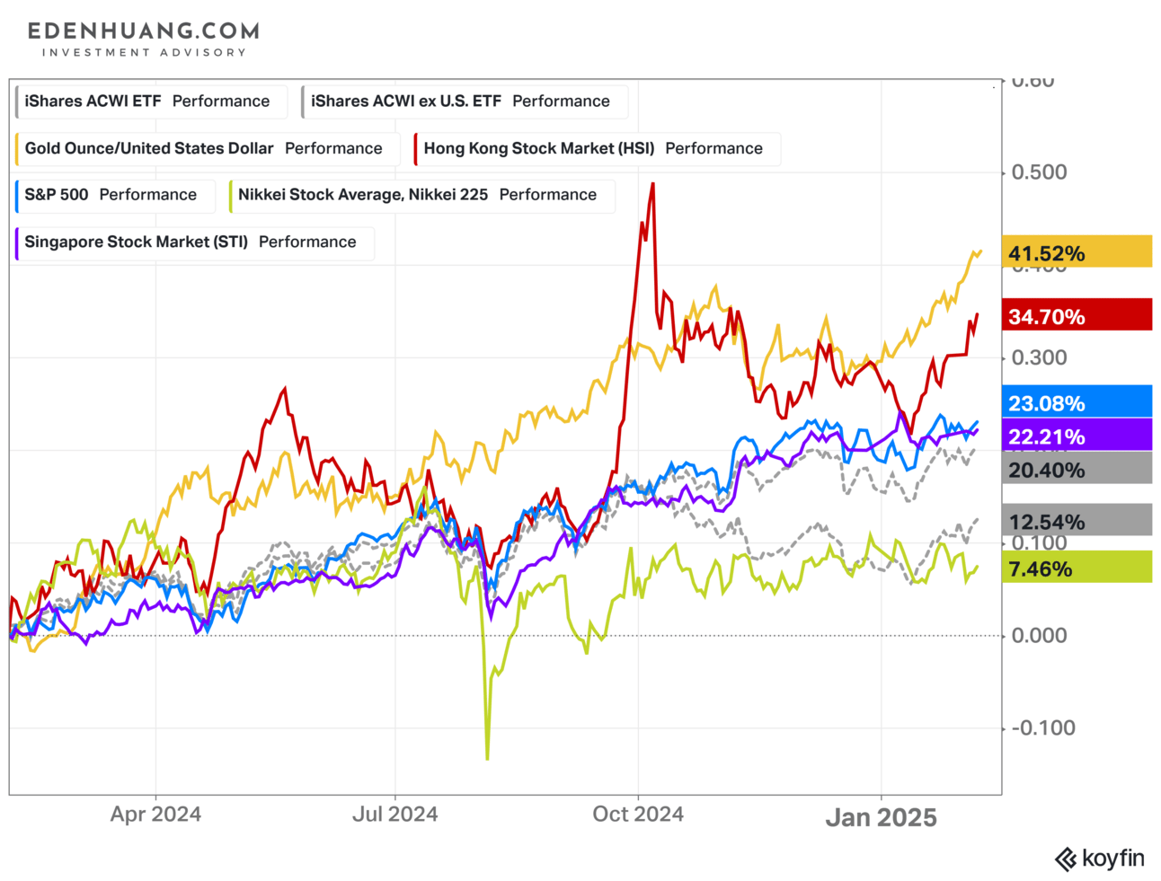 Inflation could pick up again when too much money supply is chasing limited goods and services. So far, in the capital markets, all hedging instruments against inflation and the debasement of currencies have performed very well. Gold for instance has outperformed even the S&P500 and most benchmarks in 2024. This could be like a canary in a coal mine, the market expectation for the coming years is mostly inflationary, based on the expanding money supply and the outperformance of Gold as seen in the following chart: