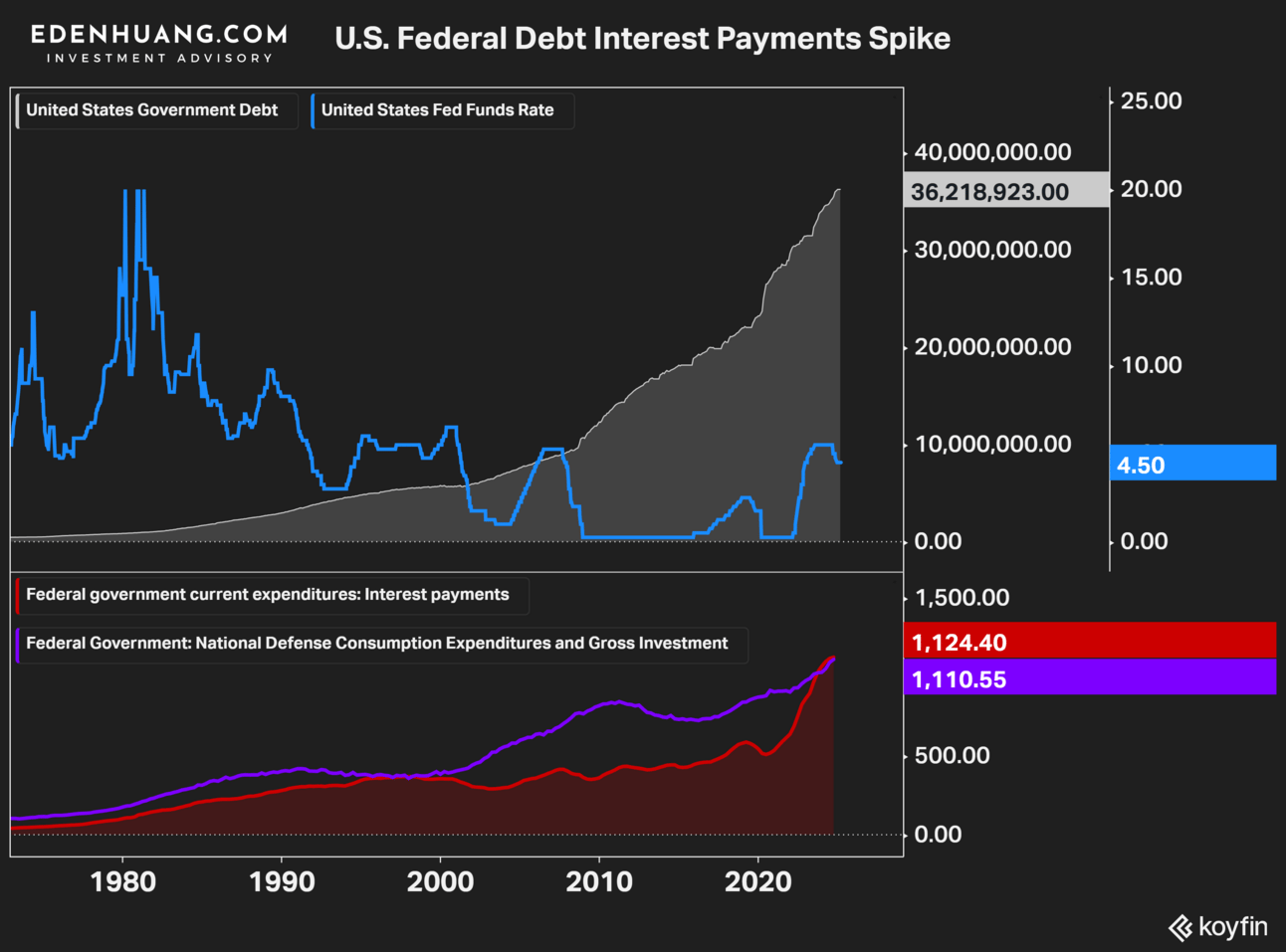 The U.S. federal debt's interest payments have become a significant and compounding burden on the nation's finances. As the government borrows more to fund its operations and programs, the interest owed on this debt grows, creating a cycle of increasing financial obligations. Rising interest rates further exacerbate this issue, as new debt is issued at higher costs, adding to the overall expense. As of FY2024, Interest Payments on the U.S. Federal Debt have reached $1Trillion level for the first time in U.S. history, and the top 3 line items of the U.S. Federal Budget, surpassing their entire defense budget.